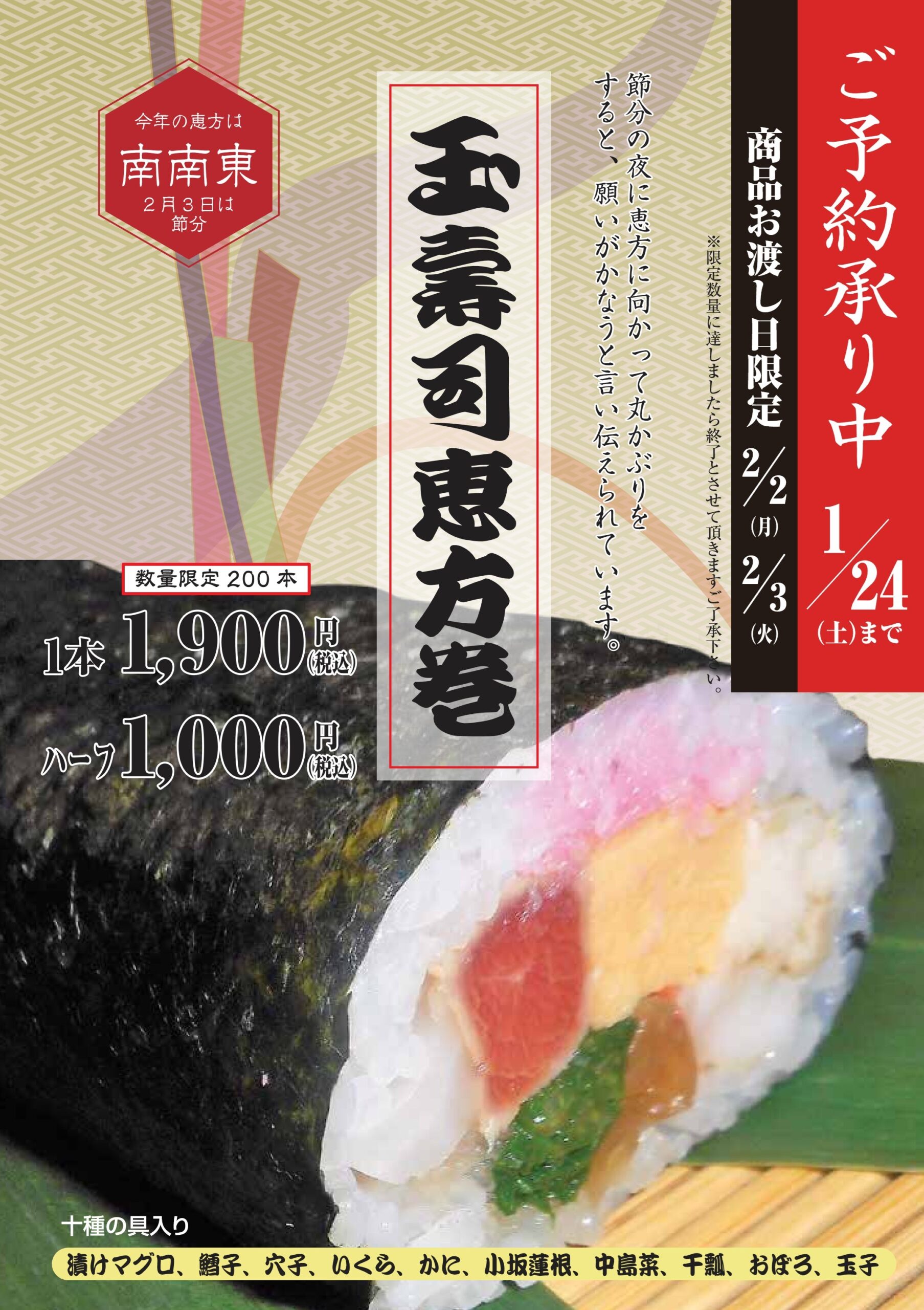 お知らせ News 2026年 玉寿司恵方巻き 予約受付中 2026.01.20 平素は金澤玉寿司をご利用いただきまして誠にありがとうございます。 2026年の玉寿司恵方巻きのご予約受付中です。 「玉寿司恵方巻」 ※数量限定 1本 1900円(税込) ハーフ1000円(税込) (漬けマグロ・鱈子・穴子・いくら・かに・小坂蓮根・中島菜・干瓢・おぼろ・玉子) 受け渡し日は2/2(月)・2/3(火)となっております。 ※ご予約・お問い合わせは店頭にて 一覧へ戻る カテゴリー 全て 未分類 金澤玉寿司総本店 せせらぎ通り店 お知らせ 金澤玉寿司総本店Kanazawatamazushi sohonten せせらぎ通り店Seseragi Dori Store